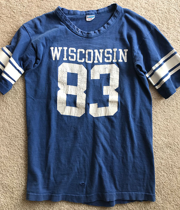 My closet is full of stories, but one item of profound love is a weathered old blue t-shirt with the word 'Wisconsin' and the number '83' printed on it in cracked white paint. I stole this shirt from my mother (sorry I never gave it back to you, mom!) who acquired it when she attended college in the late 70's. Word has it my dad was known to wear it back in the day, too. (Picture shared without permission. Sorry bro.)