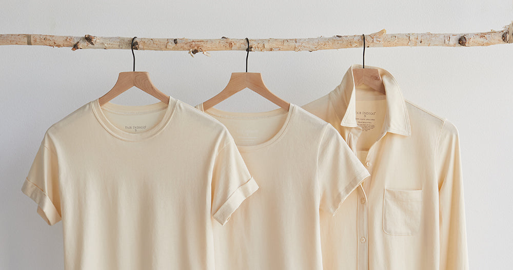 Select pieces in our 100% organic Peruvian Pima cotton clothing contain no dyes, just the natural color of the organic cotton (a creamy off-white shade). Please note because there are no dyes use and cotton harvests vary in color, there is some variation from piece to piece, season to season.
