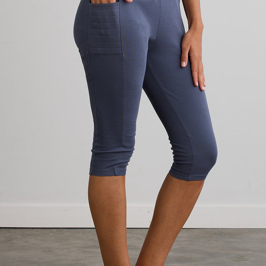 All-cotton leggings are hard to find (especially organic). And this crop version has the handy hip pockets we all need to stash our phones and keys. Same great fit as our original leggings, these capri leggings with pockets are slim through the legs but not tight fitting. They feature a comfy, flat-lying elastic waistband. Soft, mid-weight 100% Pima cotton interlock fabric is knit to achieve 'mechanical stretch' - wonderfully comfortable, stretchy, and spandex-free.