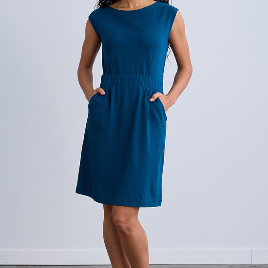 This cap sleeve dress with pockets is made from luxuriously soft organic Pima cotton in a durable interlock knit. Designed with a flattering ballet neckline, comfortable elastic waist, and functional pockets. Whether you're heading to work, traveling, or going out to dinner, this dress is your go-to for effortless style and long-lasting comfort.