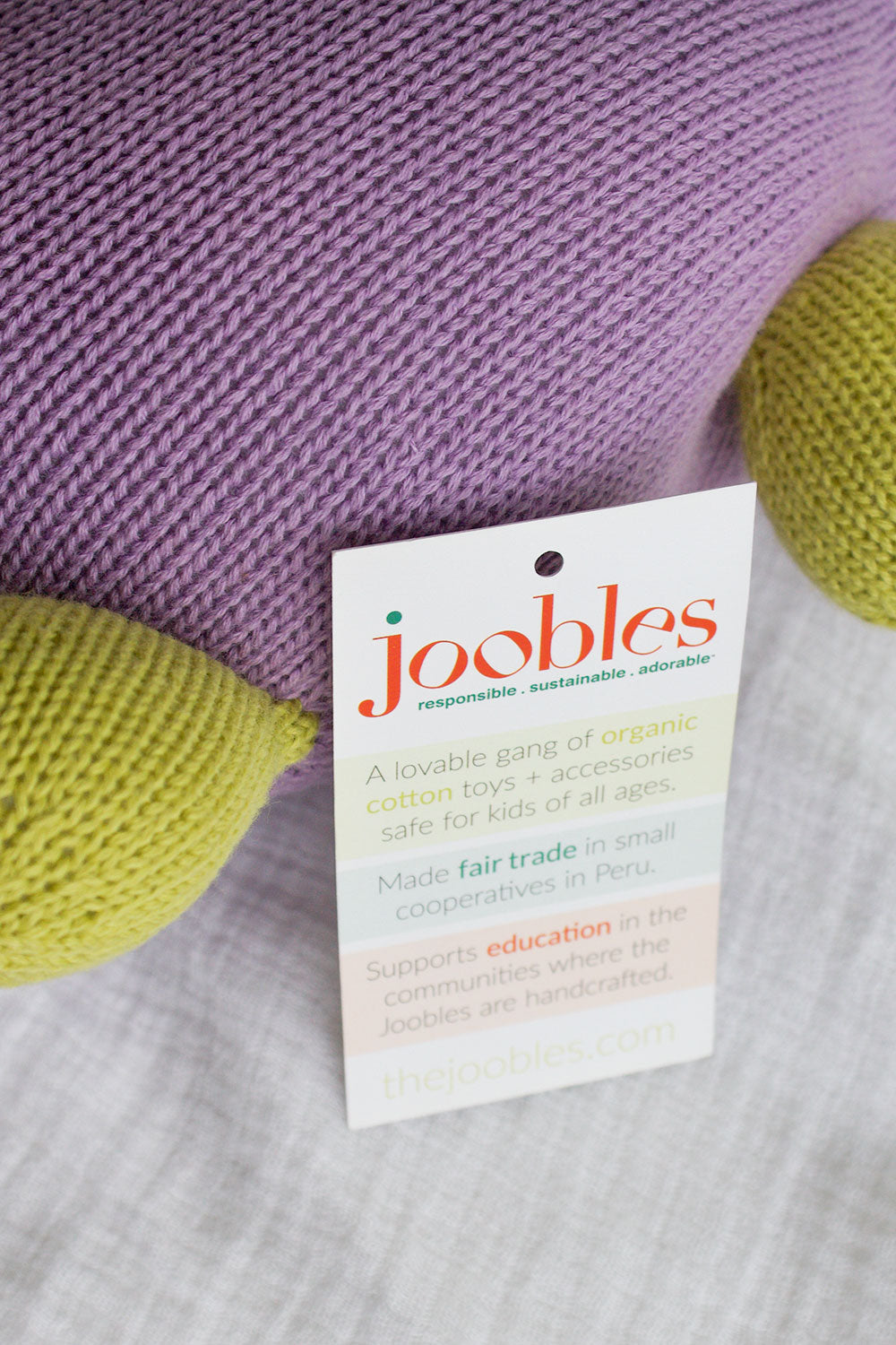 All of the good stuff, none of the bad. Just like Fair Indigo's clothing, our Joobles organic stuffed animals are made with pure Peruvian organic cotton - in this case Tanguis, a close cousin of famed Pima cotton, with a fiber thickness better suited for stuffed animals. No pesticides or harmful chemicals are used in the cotton. Earth-friendly. Kid-friendly.
